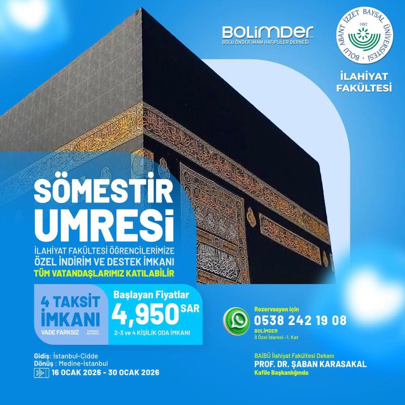 Bolu Önder İmam Hatipliler Derneği (BOLİMDER) ile Bolu Abant İzzet Baysal Üniversitesi İlahiyat Fakültesi iş birliği kapsamında, 2025–2026 eğitim-öğretim yılı sömestir döneminde bir Umre Programı düzenlenecektir.